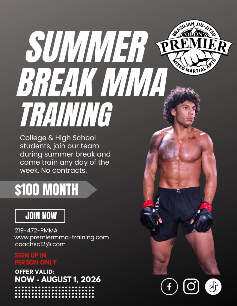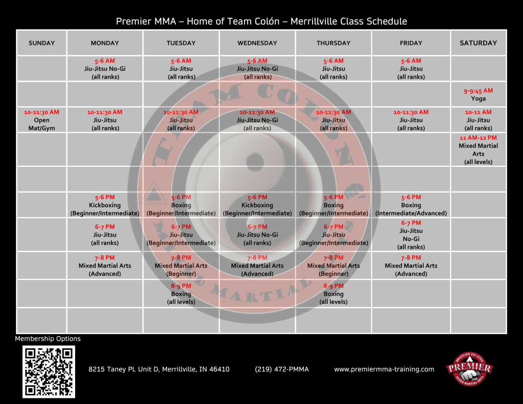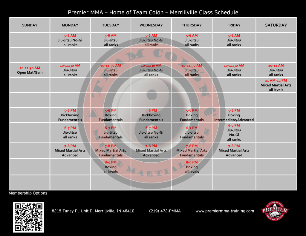 Welcome to premiermma-training.com, the official website of Colón’s Mixed Martial Arts Training Center in NWI, conveniently located in Merrillville, IN., just 2 miles West of I65 on Taney PL and US 30.